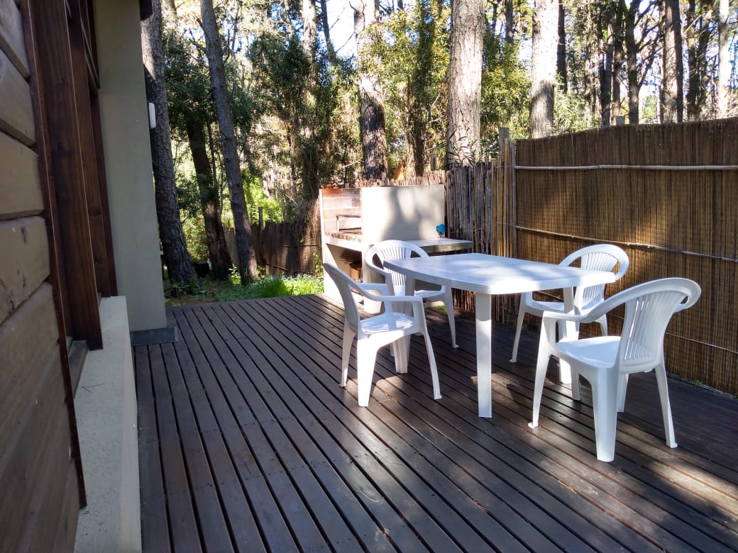 Deck y parrilla, sillas y mesa para el exterior. Dos reposeras para la playa.