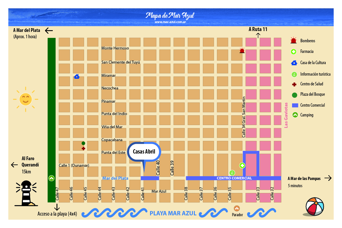 Casas Abril es un pequeño complejo de cuatro unidades (dos casas y dos mono-ambientes) que reúne los tres elementos esenciales brindados por la naturaleza de Mar Azul: cercanía al mar, en el bosque y amplios espacios verdes para disfrutar del sol. Las unidades se destacan por su amplitud y luminosidad debido a que no son lindantes entre sí, están distribuidas en un vasto predio de añosos pinos y jardín-parque y todos sus ambientes dan al exterior.
