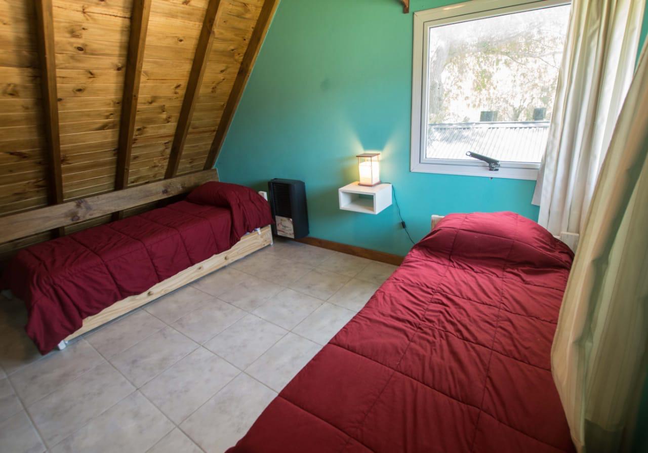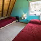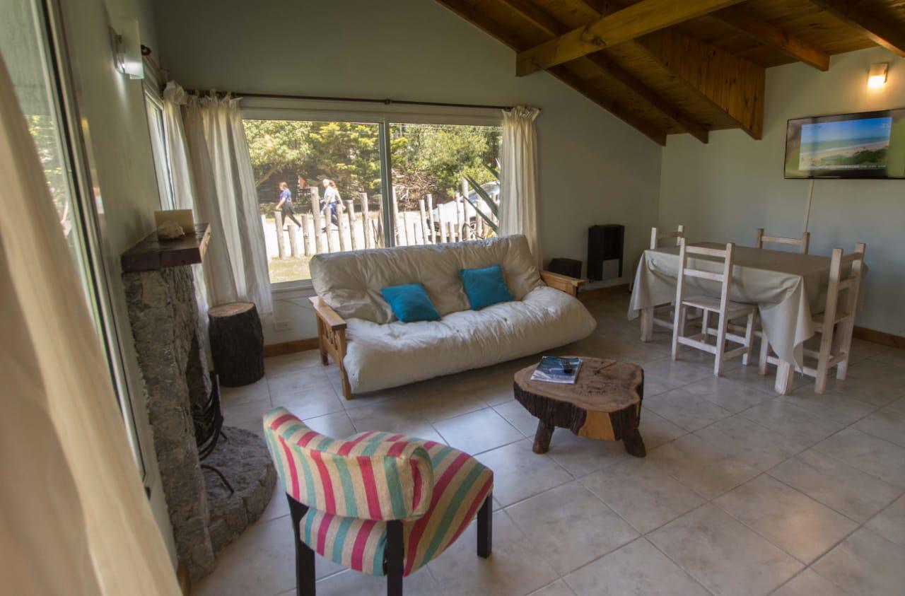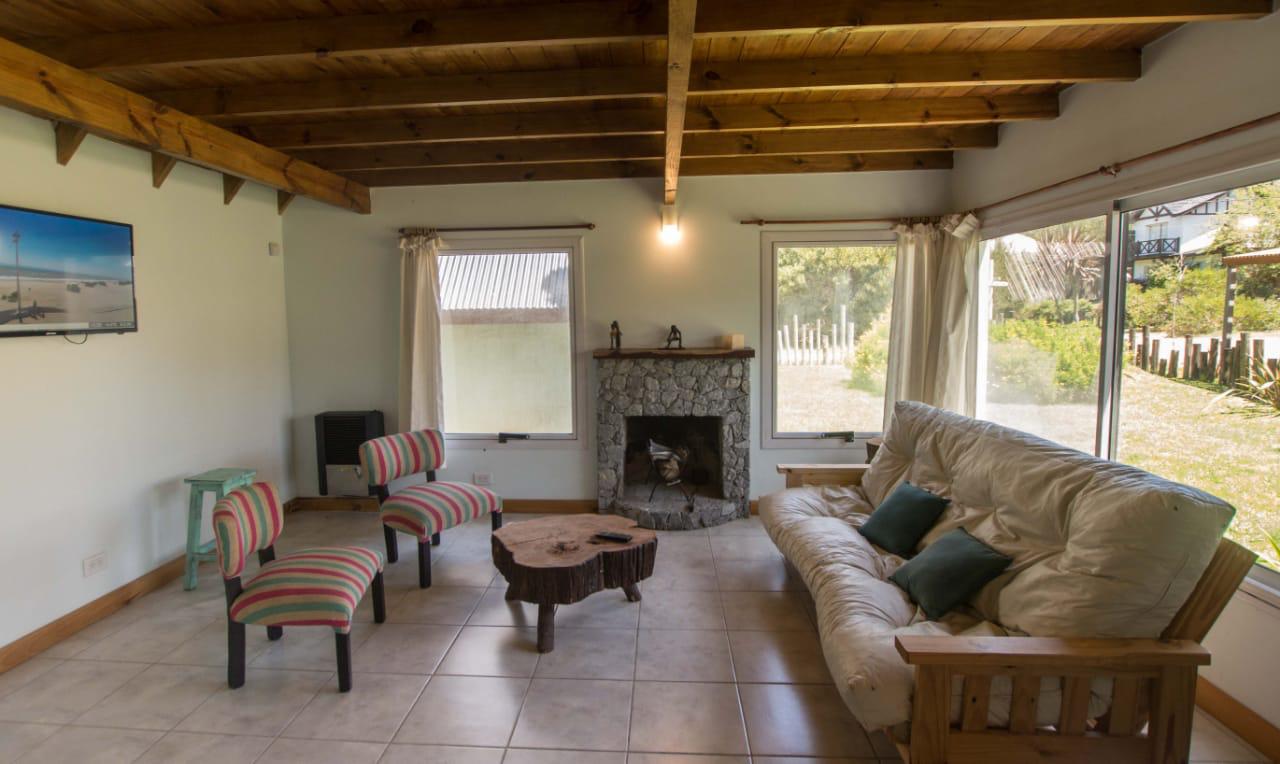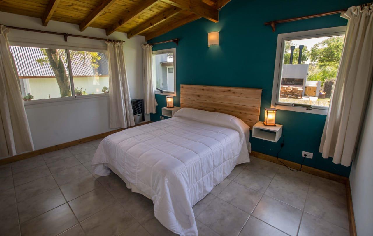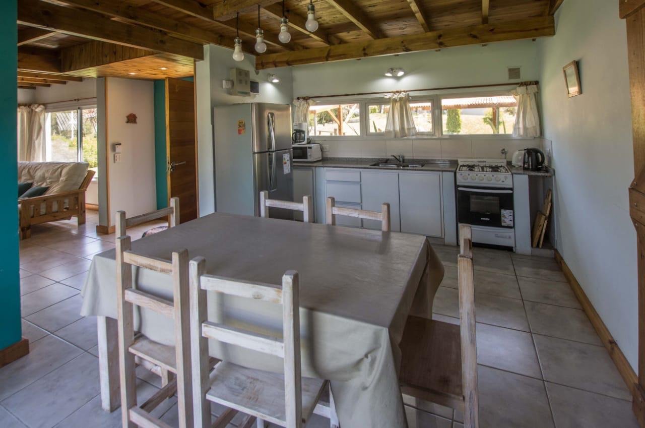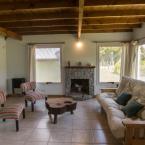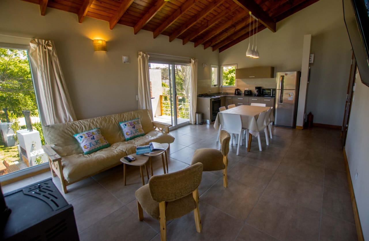 Dormitorio principal en suite con sommier 2 ½ pl jacuzzi para dos personas, con ventana en el techo, blackout con doble cortinado, ventilador de techo, cocina completa, freezer, microondas, cafetera, tostadora etc living con hogar a leña, tv, lcd futon dos plazas.