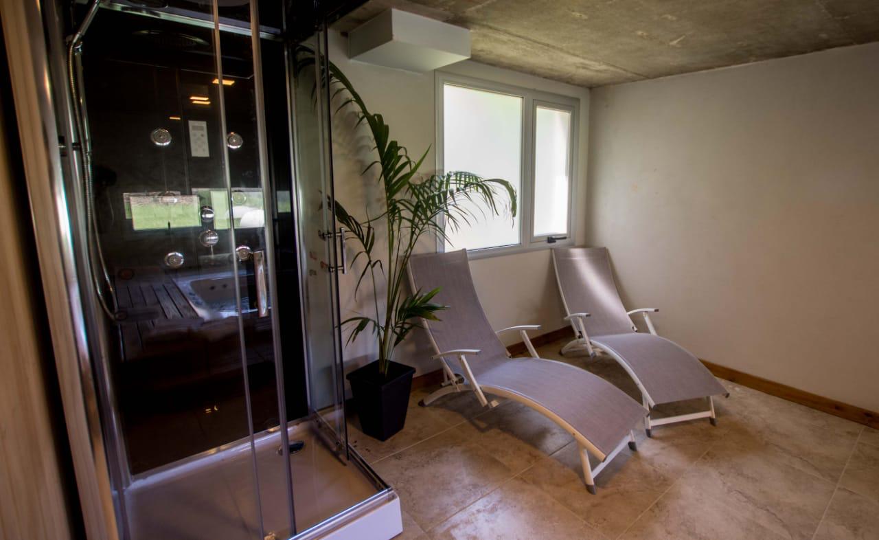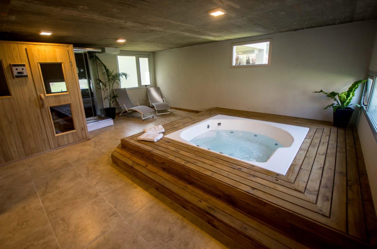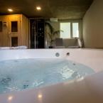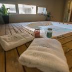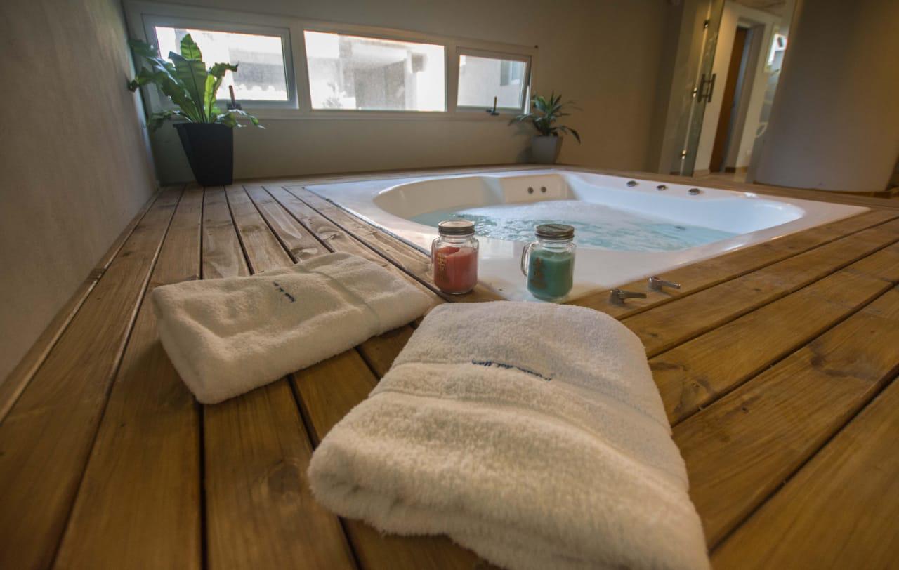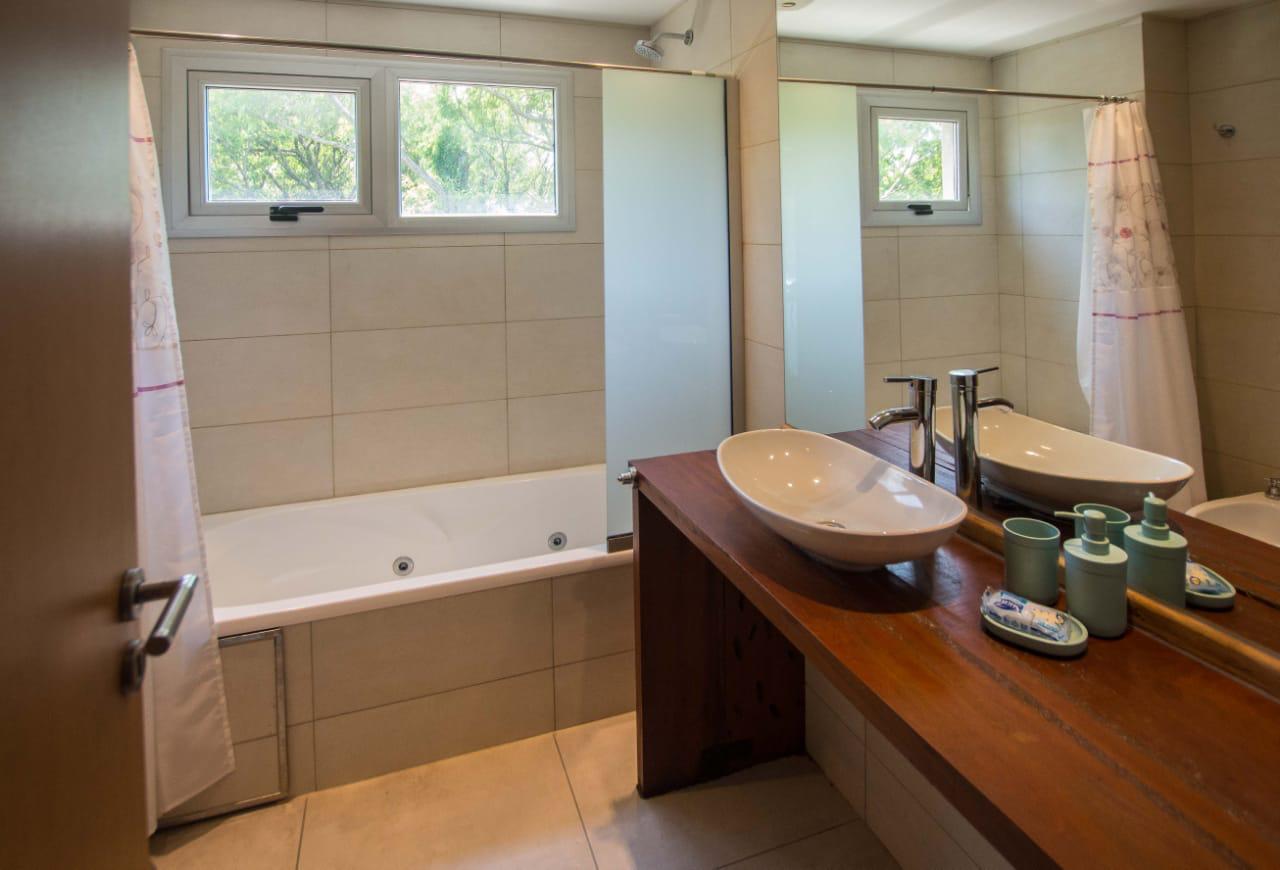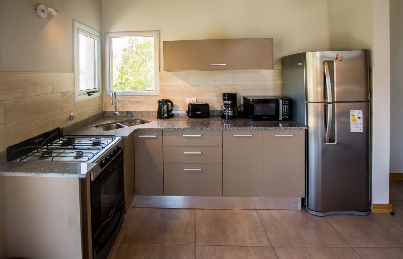 Dormitorio principal en suite con sommier 2 ½ pl jacuzzi para dos personas, con ventana en el techo, blackout con doble cortinado, ventilador de techo, cocina completa, freezer, microondas, cafetera, tostadora etc living con hogar a leña, tv, lcd futon dos plazas.