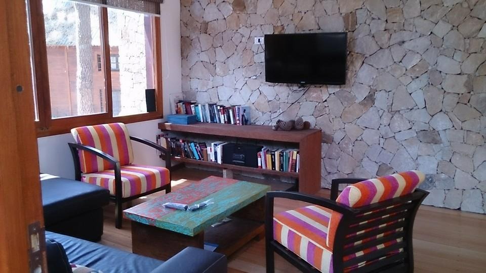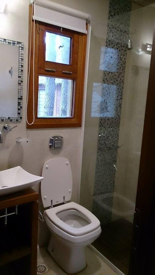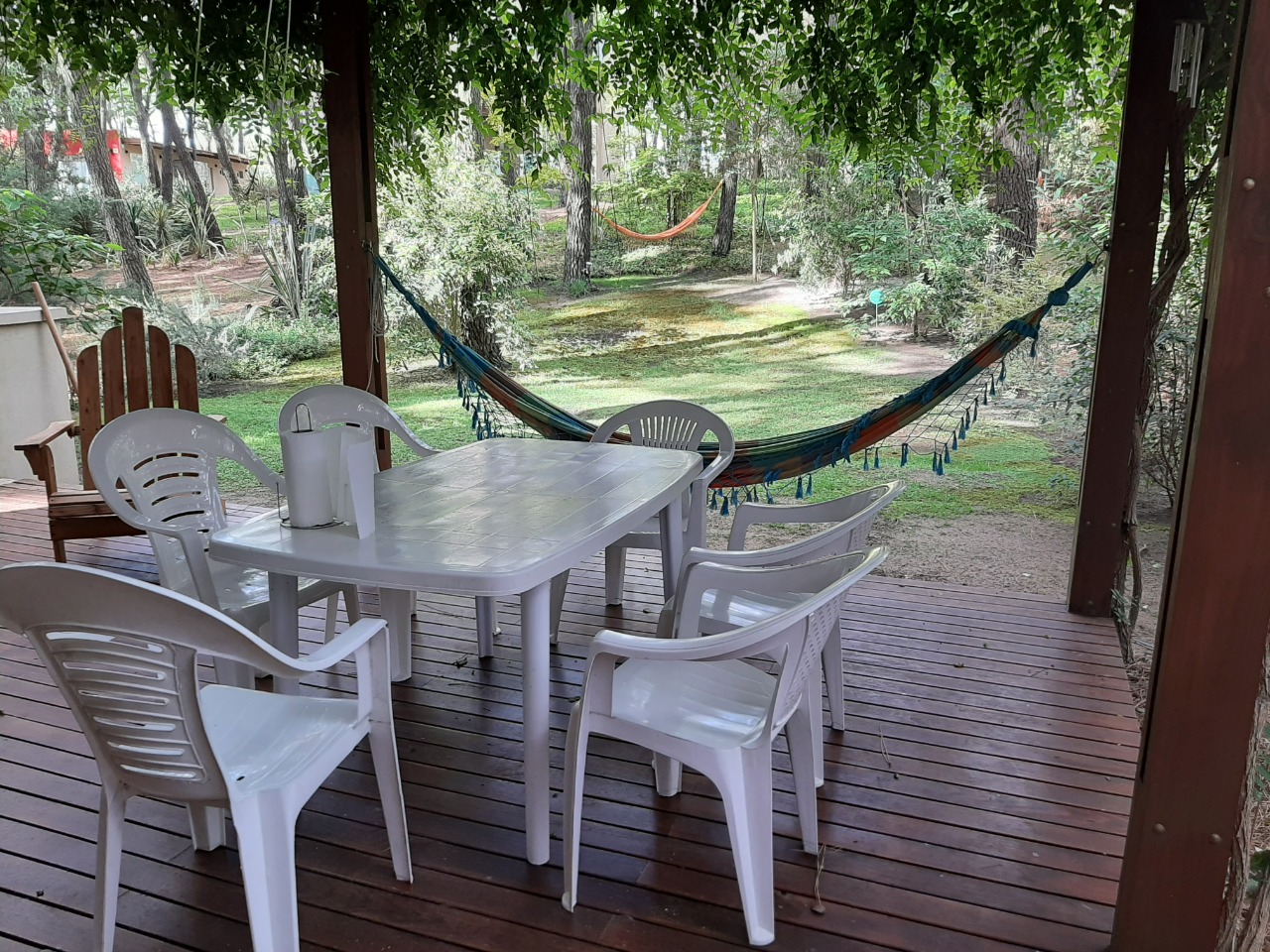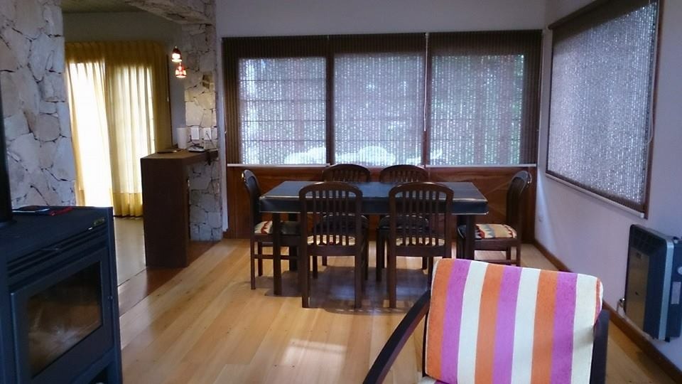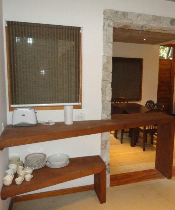 Planta baja: living comedor, cocina, baño con ducha y lavadero. La cocina se encuentra equipada con heladera con freezer, cocina tradicional, microondas, cafetera electrica, tostadora, pava eléctrica y minipimer, vajilla completa. Living comedor cómodo juego de sillones, mesa ratona, TV, salamandra, mesa y sillas. Barra que separa la cocina con router fibra óptica del wifi y teléfono para llamadas locales. Lavadero con lavarropas automático, tender, sombrilla y reposeras. Deck con parrilla mesa y sillas de jardin con vista al bosque. Dos hamacas paraguayas para colocar en el deck y en el fondo del terreno. Luz, gas y telefono incluidos. Alarma monitoreada. Persona residente encargada