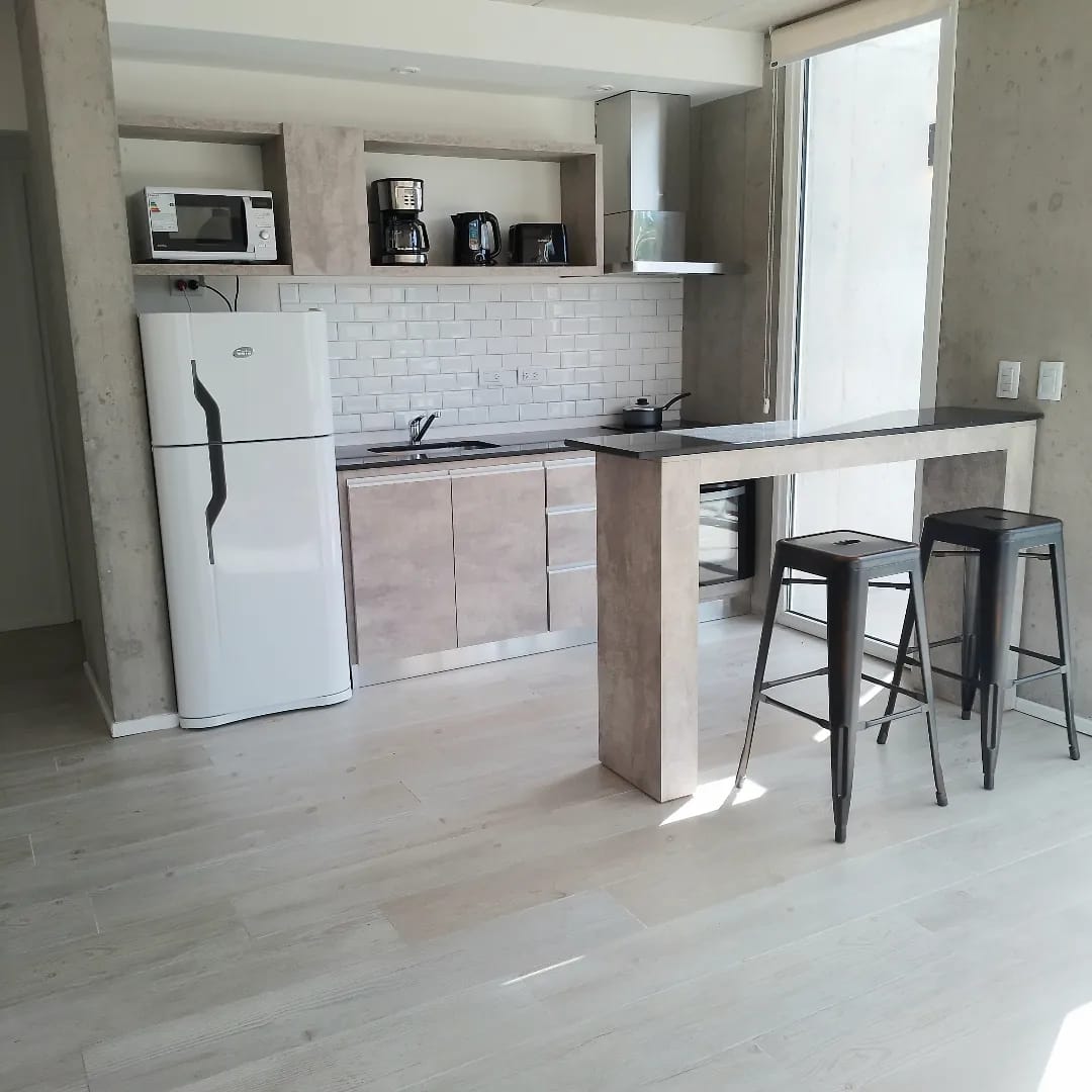 Amplio living comedor, cocina totalmente equipada, dos baños y parrilla individual integrada.