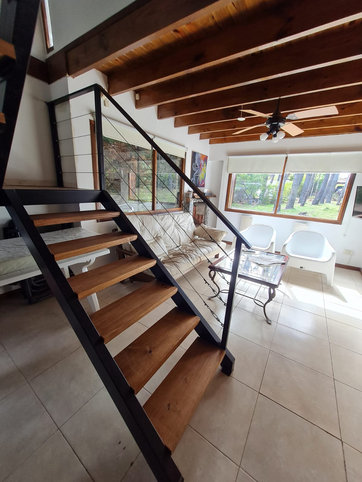 ESPACIO BOSQUE, hasta 7 personas, posee amplio living comedor con hogar a leña, cocina integrada con desayunador, toilette, futón de dos plazas, TV plana de 40”. En planta alta cuenta con una habitación matrimonial con TV y ventilador de pared, otra habitación para cuatro personas con camas individuales y vestidor, baño completo con jacuzzi doble. La escalera posee puerta de protección para niños. Importante deck con parrilla, juegos de mesa y 6 sillones para exterior, 2 reposeras para deck con diferentes posiciones.