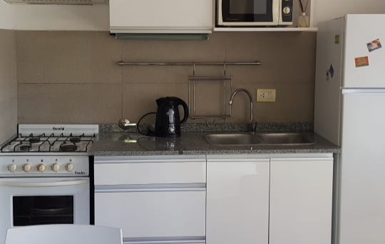 ESPACIO MAR, hasta 4 personas, posee living comedor con cocina integrada, sofá cama con cama debajo, TV plana de 40”, habitación matrimonial con TV y ventilador de pared, baño completo con jacuzzi, importante deck con parrilla, juego de mesa y 4 sillones para exterior.